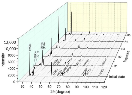 As said above, according to XRD, Zr-1%Nb alloy contained the α-phase (Table 3), also, a very small amount of hydride phases based on zirconium may appear in the material [23], as shown by the appearance of a small peak between 33–35°, their calculation has not been performed. After HPT in all conditions, the ω-phase appears in the amount of 80% and more due to α → ω transition (Figure 3), as earlier shown in [9,10,11,12,13]. The studies [10] show that α → ω transition is possible for pure Zr under the action of HPT at room temperature under 6 GPa, then no ω-phase occurred during HPT at 2 GPa. In the experiment, the ω-phase occurred as early as at HPT P = 2 GPa (Table 3). Hence, the difference of 1% Nb in Zr leads to α → ω phase transition at lower HPT pressure (P = 2) than in the case of HPT of pure Zr [10]. In the Zr-1Nb structure after SPD, the appearance of a β-phase is also possible, however, due to the superposition of the peaks of the β and ω phases, its identification is an ambiguous task. By comparing states R1 and R4, a conclusion can be made that higher HPT pressure (6 GPa) leads to an increased fraction of the ω-phase (up to 96%). A similar influence of pressure was found earlier [10]. It should be also noted that HPT P = 6 GPa, n = 1 (R3) leads to the formation of a higher fraction of the ω-phase (93%) than HPT P = 2 GPa, n = 10 (R1) or ACC HPT P = 2 GPa (R2), which shows a high role of the strain degree (n) in ω-phase formation and applied pressure in these HPT conditions. Let us note that the content of the α-phase in samples R4 (HPT P = 6 GPa, n = 10) and R5 (ACC HPT P = 6 GPa, n = 10) becomes minimal, which is due to the highest degree of deformation during HPT and more intense phase transformations of the structure in comparison with other regimes.
