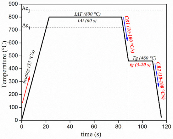 Graphic representation of the thermal cycles experimentally simulated by quenching dilatometry. The heat treatment variables studied (CR1, tg and CR2) and corresponding range are highlighted in the cooling profile, taken from [26].
