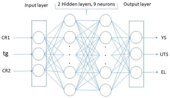 Once the MSE is computed, the weights in the hidden layers of the ANN model must be modified in a smart way in order to reduce the MSE. In fact, this becomes an optimization problem where the minimum of MSE as the objective function must be reached. The Levenberg–Marquardt algorithm is typically used to solve such problem. In this work the defined ANN architecture was of the form 3-9-9-3 and it is depicted in Figure 2. The ANN model was implemented in MATLAB. The reported ANN structure was chosen in this manner since it provided the best fitting among several tested configurations. The hyperbolic tangent sigmoid function was used as activation function, 48 epochs were needed to reach a training performance of 43.0639 with a corresponding gradient value of 1.0047 × 10−8. Furthermore, a comparison between the ANN output responses and the real experimental data is reported in Figure 3, where an excellent performance of the BPNN trained model is observed. Thus, the computed BPNN model was successfully used to predict the galvanizing process in advanced DP steels.
