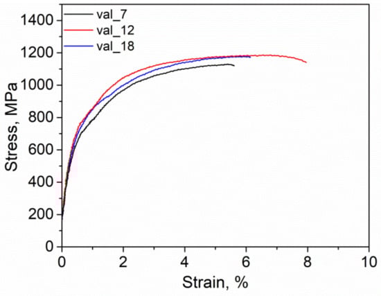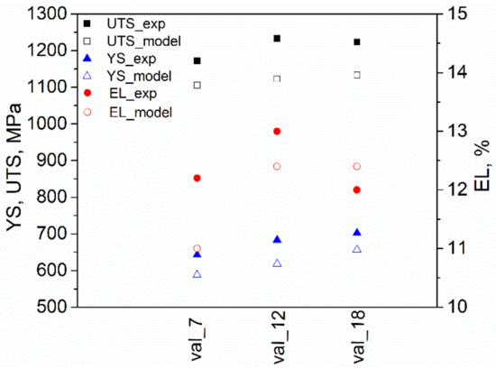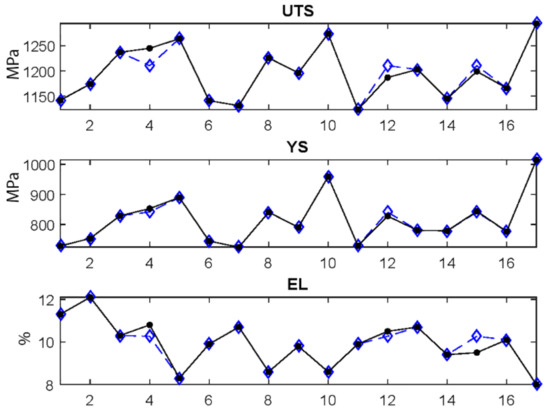 As it was already mentioned in previous sections, the main purpose in this study related to the mechanical properties in order to maximize UTS, EL and minimize YS. In particular, a BPNN model and the nondominated sorting genetic algorithm (NSGA) were applied for the mathematical modeling and genetic optimization, respectively. The achieved total set of optimal solutions known as Pareto front set is reported in Table 3. The optimized values of heat treatment parameters and response variables were experimentally validated by selecting three characteristic thermal cycle conditions (run 7, 12 and 18) that entirely satisfied the previously established mechanical properties (550 < YS < 750 MPa, 1100 MPa < UTS and 10% < EL). The mechanical properties were measured from a tensile test on micro-tension specimens heat-treated in quenching dilatometry. In Figure 6 the obtained stress-strain curves are presented, which show the usual mechanical response to uniaxial tension of this kind of advanced steels (low elastic limit and yield strength values, high strain hardening, high ultimate strength and good elongation at fracture). The resulting values of UTS and YS were taken from the experimental curves; meanwhile, EL data was obtained from the fractured samples. Table 4 contains the results derived from the artificial intelligence and genetic optimization method and the experimental results. As can be seen in Figure 7 the results predicted and optimized by BPNN and GA fully coincided for the tree cases with the experimental results. Only small deviations were observed in the most critical cases, which should be taken as insignificant considering that they did not exceed 10%. When these results were compared with previous research conducted by this research group [26], it was noted that the prediction errors of the model used in the past work for the calculation of YS (error < 7.7%), UTS (error < 3.4%) and EL (error < 7.6%) were very similar to those found with the BPNN model in this research work. Although, it is very well known that any well-trained ANN-based model is superior to any other statistical approach due to the nature of the artificial neural network structures to model non-linear phenomena. In fact, the use of artificial intelligence methods combined with genetic optimization allows solving the multi-objective optimization problem in a more practical and reliable way compared to the promising and recently proposed bio-inspired squirrels optimization algorithm studied in [40]. Considering this, the prediction error was significantly lower by the common application of artificial intelligence and genetic optimization with respect to the method based on a multi-objective metaheuristic approach using an adaptive memory procedure, MOAMP-squirrels search algorithm. It can be assumed that the best thermal cycle condition to manufacture an experimental DP1100 steel with the needed mechanical properties of 550 < YS < 750 MPa, 1100 MPa < UTS and 10% < EL was the heat treatment exposed in the run 18 because this experimental condition had the lower ratio YS/UTS desirable to achieve a greater plastic deformation necessary to produce complex automotive structural components. A YS/UTS ratio between 0.4–0.7 was reported for the cold rolled DP steel sheet to ensure a large formability range [18]. Based on the analysis and presented results it was corroborated that the non-linear BPNN model and NSGA algorithm simultaneously predicted with sufficient accuracy the mechanical properties behavior of GDP steels under galvanizing conditions.