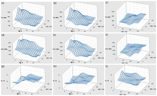 Relationships between yield strength (YS), ultimate tensile strength (UTS) and elongation at fracture (EL) and heat treatment parameters, including initial cooling rate (CR1), holding time at the galvanizing temperature (tg) and the final cooling rate to room temperature (CR2). (a) YS vs. tg and CR1, (b) YS vs. tg and CR2, (c) YS vs.tg CR1 and CR2, (d) UTS vs. tg and CR1, (e) UTS vs. tg and CR2, (f) UTS vs.tg CR1 and CR2, (g) EL vs. tg and CR1, (h) EL vs. tg and CR2, (i) EL vs.tg CR1 and CR2.
