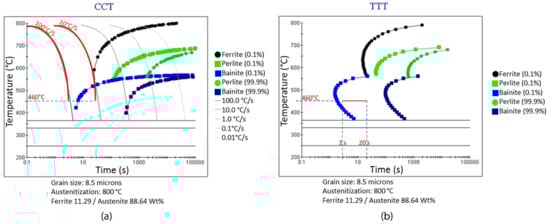 Phase transformation diagrams calculated by using JMatPro software. (a) Continuous cooling transformation (CCT) diagram and (b) time-temperature-transformation (TTT) diagram.