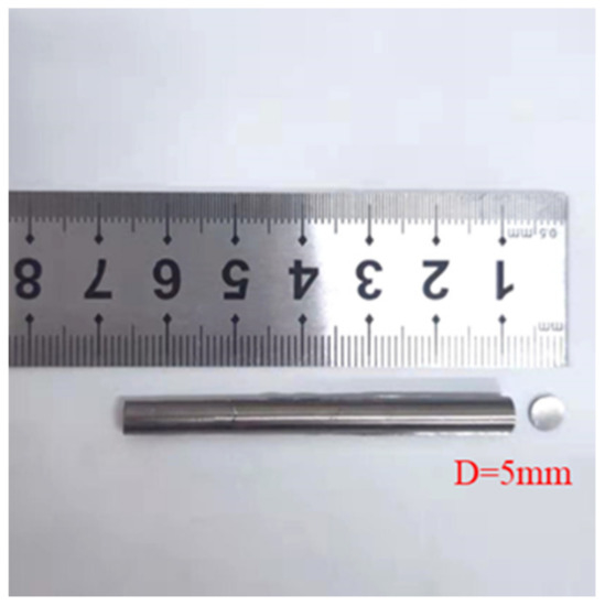 Under the protection of purified argon atmosphere, the ingot with a nominal composition of La65Al14Ni5Co5Cu9.2Ag1.8 was prepared by arc-melting a mixture of pure La, Al, Ni, Co, Cu, and Ag elemental metals (all 99.9 wt% purity), which were provided by ZhongNuo Advanced Material (Beijing, China) Technology Co., Ltd. In order to ensure the uniformity of the microstructure, each ingot was re-melted 5 times. Cylindrical rods having a diameter of 5 mm and a length of 60 mm were obtained by tilt-casting into a copper mold under argon atmosphere. The outer appearance of the cylindrical rod is shown in Figure 1. The as-cast rods were sliced to guarantee that each sample had a thickness of about 0.8 mm and a mass of about 40 mg. The annealing treatment was carried out by a Perkin Elmer-8000 DSC (Waltham, MA, USA) at a heating rate of 20 K/min under nitrogen atmosphere. To optimize the best annealing temperature, various holding temperatures near Tg have been used to treat the as-cast La-based BMG with fixed time (5 min). The isochronous annealing treatments at various temperatures were conducted at 373, 383, 393, 403, 413, 423, and 433 K for 5 min, respectively. Based on the observed enthalpy recovery in DSC curve, the isothermal annealing temperature was set to be 393 K and the annealing time were 10, 60, 120, and 240 min, respectively. The as-cast and annealed samples were tested using a Japan D/max 2500 PC X-Ray diffractometer (XRD) equipped with Cu-Kα radiation to investigate the microstructural stability (Rigaku Corporation, Tokyo, Japan). Thermal stability was investigated using a Perkin Elmer-8000 DSC (Waltham, MA, USA) from 323 K to 573 K at a heating rate of 20 K/min under nitrogen atmosphere. Nanoindentation experiments were performed using a Switzerland UNHT nanoindenter with a Berkovich indenter under a load-control mode (CSM Instruments, Peseux, Switzerland). Each sample was tested 5 times. Indentation morphologies were examined by a USA 5500 AFM. The microhardness was tested by a HV-1000Z (CN) microhardness tester (FengZhi Instrument, Jinan, China) at a load of 20 g and a holding time of 10 s, respectively.