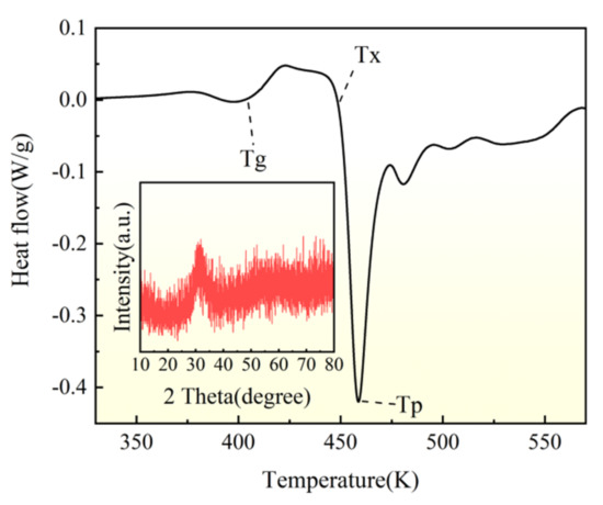 - Qiao, J.C.; Pelletier, J.M. Enthalpy relaxation in Cu46Zr45Al7Y2 and Zr55Cu30Ni5Al10 bulk metallic glasses by differential scanning calorimetry (DSC). Intermetallics 2011, 19, 9–18. [Google Scholar] [CrossRef]