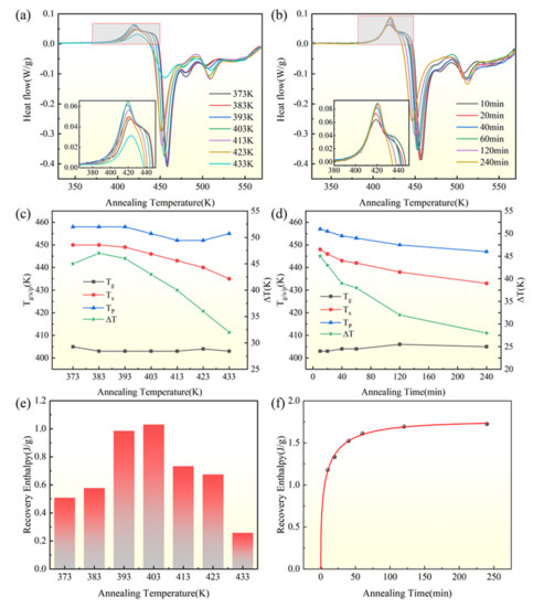The relationship between recovery enthalpy and annealing temperature is illustrated in Figure 3e. The variation of recovery enthalpy on annealing can be interpreted based on the concept of solid-like regions and liquid-like regions in amorphous alloys [24]. As we know, the amorphous structure is heterogeneous at the nanoscale and the areas with close atomic arrangement can be regarded as solid-like regions, while the areas with sparse atomic arrangement can be regarded as liquid-like regions accompanying with more free volume. When the annealing temperature increases, the excess free volume decreases more rapidly, this helps to increase the proportion of solid-like region, resulting in the increase of the short-range order and the energy required for the transition from glass state to the supercooled liquid state. The concentration of the solid-like region is high enough at the annealing temperature above 403 K, which may have a non-negligible interface interaction with the liquid-like zone [25]. This interaction at the interface may increase the energy of the system and further weaken the degree of enthalpy recovery.