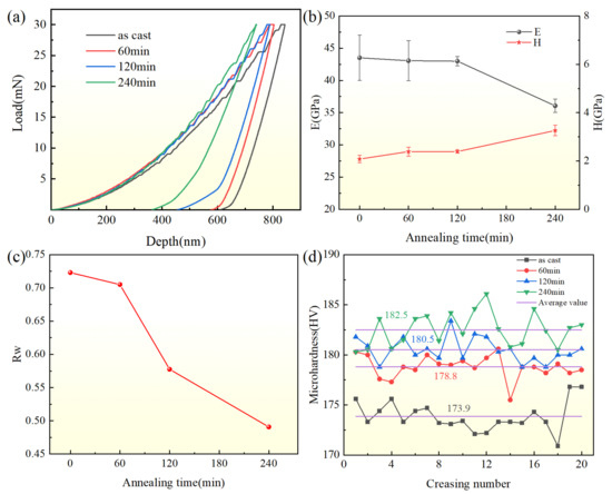 where is the residual depth after unloading and is the maximum depth under loading. Figure 4c shows the dependence of Rw on annealing time in La-based BMG annealed at 393 K. The calculated values of steeply drop with the annealing time, indicating the loss of the plasticity in the annealed La-based BMG.