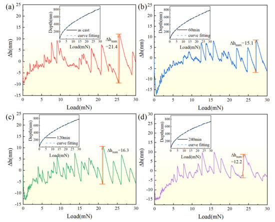 The characteristic of displacement mutation, also called serrated flow or pop-in, can be found in the load-depth curves for the as-cast and annealed La-based BMGs. In order to investigate the serrated flow behavior more intuitively, we use the following power law Equation (3) to fit the depth-load curve of the loading stage to obtain the baseline, and then subtract the baseline to get the relation curves based on the depth difference Δh and the load, as shown in Figure 5. The power law equation is introduced [33]: