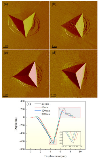 The indentation morphology of the as-cast and annealed La-based BMGs shown in Figure 6a–d presents that as the annealing time increases, the number of shear bands around the indentation decreases. The serrated flow behavior is always associated with the activation and propagation of single or multiple shear bands during plastic deformation. The liquid-like region containing a large amount of excess free volume is easy to form shear transformation zone (STZ) under the action of external force. The nucleation of shear band usually takes place in STZ. The annealed BMG undergoes structural relaxation, and the proportion of the liquid-like region decreases, so the degree of structural heterogeneity decreases and it is more difficult for the nucleation of shear band. Since plastic deformation is irrecoverable during nanoindentation, the plastically deformed BMG tends to flow in the opposite direction to the applied pressure, resulting in the accumulation around the indentation surface, corresponding to the area B shown in Figure 6e. With the increase of annealing time, the stacking area reflecting the ability of plastic deformation gradually decreases, which is consistent with the law described in Figure 4c. Otherwise, the partially enlarged view of area A indicated in Figure 6e shows that the maximum indentation depth of the annealed sample is smaller than that of the as-cast one, and once again confirms that the structural relaxation induced by the annealing leads to the hardening of La-based BMG.