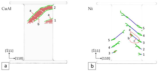 - Stukowski, A.; Bulatov, V.V.; Arsenlis, A. Automated identification and indexing of dislocations in crystal interfaces. Model. Simul. Mater. Sci. Eng. 2012, 20, 85007. [Google Scholar] [CrossRef]