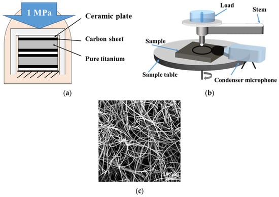 The samples used in this study comprised a 50 × 20 × 5 mm3 plate cut from the as-received plate using fine cut machining (HS-45A2, HEIWA TECHNICA, Kanagawa, Japan). Pure grade-2 Ti (composition in wt.%: 0.2 O, 0.003 N, 0.013 H, 0.25 Fe, 0.008 C, and remainder Ti) was used as the substrate material. The surface to be treated of the Ti was finished by grinding with emery paper (grade 4000). The pure titanium is heated by the air furnace in the atmosphere by using the carbon sheet. The schematic diagram of the sample setup (a) and the experimental apparatus of the wear and fricative testing (b) were shown in Figure 1. In addition, a scanning electron microscope (SEM, S-3000N HITACHI, Tokyo, Japan) image of the carbon sheet (c) was also shown in Figure 1. The elemental distribution of the cross-sectional samples was determined by energy dispersive spectroscopy on an energy dispersive analyzer (EDX, SEDX-500, Shimadzu, Tokyo, Japan). The titanium plate was placed between two pieces of carbon sheet and the load at 1 MPa was applied to it. Processing temperatures were changed from 750 to 950 °C for 2 h in the atmosphere. To determine the compound formed on the surface after processing, the treated surfaces were investigated using an X-ray diffractometer (XRD, 2200VF, Rigaku, Gunma, Japan) with CuKα radiation working at the optimum voltage of 32 kV and anodic current of 20 mA. Furthermore, the cross-section of treated samples was prepared by ion milling (IM4000, HITACHI Tokyo, Japan) with 7200 s. Microstructural and morphological characteristics of hardened layers were examined using a SEM. Surface hardness testing was carried out throughout the hardened layers of the samples using a Vicker hardness tester (HMV-1, SHIMADZU, Kyoto, Japan) with the applied load is 0.98 N to gain the hardness of the hardened layer more accurately and at a dwell time of 15 s. In order to reduce the measurement error, the sample was measured for 5 times and averaged. Ball-on-disk dry sliding tests were performed at room temperature to evaluate the tribological properties of the samples using a tribometer (FPR-2000, Rhesca, Tokyo, Japan) with a zirconium dioxide (ZrO2) ball and a counter-face with a radius of 2380 μm. Samples with the dimensions of 50 × 20 × 5 mm3 were used for wear testing with a sliding linear speed of 200 mm/s, an applied force (loading force during the wear testing) of 4.9 N, and a test time of 3600 s (corresponding to a sliding distance of 720 m). All tests were performed at room temperature. The microstructural and morphological features of the wear track after wear testing were examined using SEM under secondary electron imaging mode at a voltage of 15 kV. The fricative value is measured by a condenser microphone (TM-103, TENMARS, Tokyo, Japan) installed 20 mm above the contact point between the ball and sample. The depth profile of the sliding portion after the wear testing was measured by a laser microscope. In order to reduce the measurement error, the sample was measured four times and averaged.