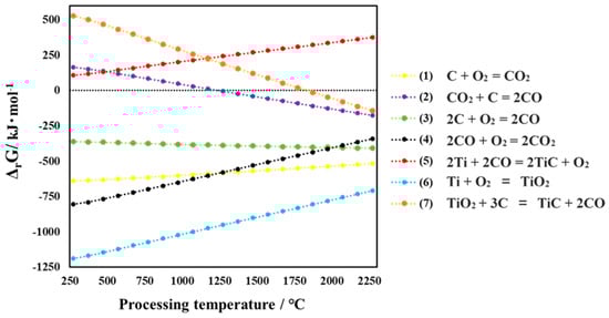 Relationships of processing temperature on the Gibbs free energy ΔrG of reactions (1)–(7).