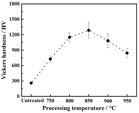 Figure 2 shows the X-ray diffraction (XRD) patterns of the surface of samples with different processing temperatures. From the XRD results, it can be seen that as the processing temperature increased, the oxide/carbide layer on the surface of the sample is gradually thickened. The intensity of the diffraction peak of the substrate phase gradually decreases. As shown in Figure 2, it was revealed that TiO2, Ti2C, and Ti8C5 were formed on the surface. It was inferred that oxygen diffused at high temperatures and became more pronounced with different processing temperature. Rosa. et al., discussed the oxygen diffusion in alpha and beta titanium in the temperature range of 932 to 1142 °C []. It was found that the diffusion rate of oxygen in beta titanium is faster than that in the alpha titanium for the same processing time. For beta titanium, the diffusion rate becomes slower as the processing temperature increases. Under the same test conditions, the X-ray detection depth is constant, and the thicker the hardened layer, the lower the detection sensitivity of the substrate peak, resulting in a decrease in the intensity of the titanium peak. When the processing temperature at 950 °C, the intensity of the oxides diffraction peak is the highest, which indicates that the content of oxides formed on the surface is the highest at this processing temperature.