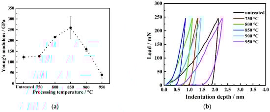 In the indentation analysis, Figure 8 shows Young’s modulus (E) and indentation depth curves of samples with different processing temperatures. The loading time, holding time, and unloading time of the indentation tester are all 5 s. The E characterized the ability of materials to resist elastic deformation. The indentation modulus of pure titanium was about 122 GPa. The indentation modulus of samples after processing was higher than the untreated sample, but when the processing temperature was higher, the value was lower than the untreated sample. From Figure 8, when the processing temperatures increased, E increased first and then decreased gradually. The modulus of elasticity can be regarded as an index to measure the difficulty of elastic deformation of the material. The larger the value, the greater the stress that causes the material to undergo a certain elastic deformation. The greater the material stiffness, the elasticity occurs under certain stress, the smaller the elastic deformation. Based on this, when the processing temperature is 850 °C, the E reaches its maximum value in this paper. This result is also mentioned in Ref. []. It means that the stiffness is the largest and the elastic deformation is the smallest in the design processing temperature []. In addition, the H also increased first and then decreased, as shown in Figure 5. When the processing temperature is 850 °C, E reaches the maximum value, but the error fluctuation range is relatively large at this processing temperature. This is due to a large amount of carbon fiber on the surface, which affects the measurement results.
