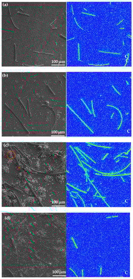 The SEM micrographs and EDX analysis of surfaces with different processing temperatures are shown in Figure 9. After processing, the surface of the sample is cleaned with a nylon brush. The remaining carbon fiber content of the surface is shown in Table 3. As shown in this table, when the processing temperature increased, the carbon fiber content increased first and then decreased. In addition, when the processing temperature is 850 °C, the carbon fiber content got the maximum value. It shows that at this processing temperature, the carbon fiber content remaining on the surface is the largest. As shown in Figure 9, when the processing temperature at 750 °C, it is almost no carbon fiber on the surface. During the processing temperature increased to 900 °C, the content of carbon fiber on the surface is less. In addition, there are traces of carbon fiber peeling off the surface. It is due to the decrease in the adhesive between the carbon fiber and the surface, causing the carbon fiber to peel off. When the processing temperature is 950 °C, although there are carbon fibers on the surface, almost all of them have peeled off. It can be seen from Figure 9 that in addition to carbon fibers, there are also white substances on the surface of some samples. As shown in Figure 9, when the processing temperature is 750 °C, the white substance does not exist on the surface. From the subsequent experimental results shown in Figure 10, it can be seen that the white substance is caused by the phenomenon of whisker growth. The driving force of the whisker growth phenomenon is the existence of compressive stress [,,]. When the processing temperature is 750 °C, there is tensile stress. At this processing temperature, whisker growth does not occur, and there is no white substance. The specific discussion can be seen from the following discussion. As the processing temperature increases, the content of the white substance increased first and then decreased. Base on this phenomenon, perform magnification (red circle position) and point element analysis on Figure 9c, and the results are shown later in present research report.