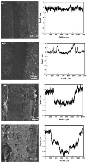 The 2D profilometric views of both untreated and treated samples are shown in Figure 12. From the 2D profiles showing the wear depths, when the processing temperature is 850 °C, it is clearly seen that the wear resistance of the untreated sample is improved substantially. A wide and deep wear track develops on the untreated sample after wear testing. The rough 2D wear track was seen in Figure 12a. The untreated sample shows a larger and deeper wear track compared to treated samples. Severe plastic deformation with heavily smearing and scratches occur on the surface of untreated samples during wear testing. Comparing the measured wear depth value of treated samples and the untreated sample, when the processing temperature at 750 °C, the wear track was deeper, but it was lower than the untreated sample. It is due to the increasing hardness reduced the impact on the sample when the ball wore it down. When the processing temperature is 750 °C, the hardened layer is very thin, and micro-particles will be generated that increase the wear. This consideration is supported by the fact that many small particles on the edge of the wear scar were observed in the wear scars observation results in Figure 12. When the processing temperature is 850 °C, the worn surfaces shows very limited deformation and smearing, and the wear depth is decreased significantly, which is related to the hardened layer formed. The hardened layer plays a role in protecting the substrate Ti. As can be seen from Figure 4, the hardened layer at this processing temperature is the thickest and it can be clearly seen that the wear depth was shallower when the hardened layer was thicker. This extraordinary improvement in wear resistance of the treated sample is attributed to the hard surface layer formed during processing (Figure 4). In addition, it can be seen from the 2D profilometric view at this processing temperature that the surface is uneven. This is due to a large amount of carbon fiber existing on the surface. As pointed out above, a surface layer with ultra-high hardness was achieved on the top-most layer with the substrate having gradually decreasing hardness. Such surface formation is beneficial, especially for material wear resistance because the hard surface layer increases both the adhesive and abrasive wear resistance of the soft Ti substrate. The layer beneath just below the top-most layer with relatively low hardness may have a good damping effect which prevents delamination during rubbing, especially under heavy loading conditions. When the processing temperature is higher than 850 °C, the wear becomes serious. Specifically, when the processing temperature at 900 °C, the wear width and wear depth reached 793 μm and 16.0 μm, respectively. In addition, the wear width was wider and there is obvious adhesion on the surface of the wear scar. Moreover, it can be seen from the results in Table 5, that when the processing temperature is increased to 950 °C, the width of the wear scar becomes wider and the depth of the wear scar becomes deeper. The maximum values of 1024 μm and 19.4 μm are reached, respectively. This indicates that the wear has become severe on the surface of the hardened layer. It is a result that the hardened layer peeled off and generates many particles on the surface lead to abrasive wear become serious.