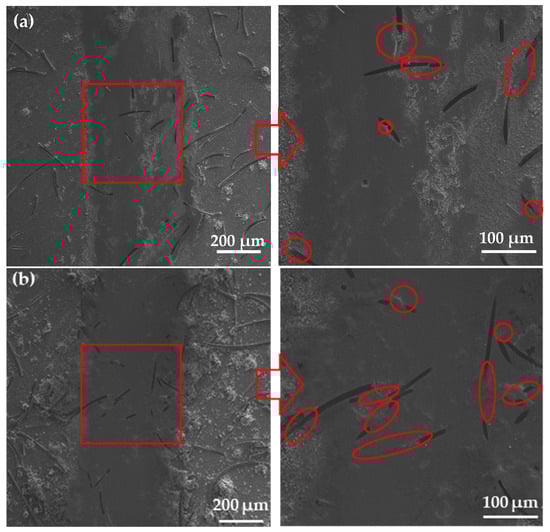 SEM micrographs of carbon fiber in wear scar with processing temperatures at (a) 800 °C and (b) 850 °C. (Enlarge the position of the red box, and the result is shown in the figure on the right. The red circle is where the worn debris exists.).