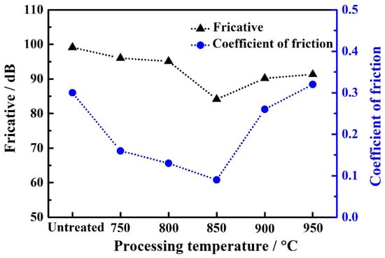 - This processing reduced the fricative value and coefficient of friction. As the processing temperature increases, the fricative value of the samples decreases initially and then increases. When the processing temperature is 850 °C, the fricative value and coefficient of friction reached their minimum values, respectively.