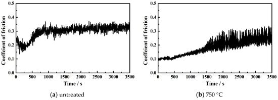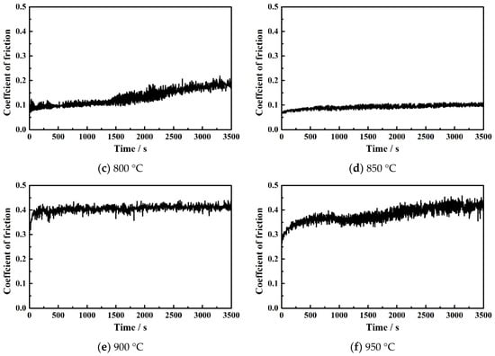 Coefficient of friction variation with the wear testing time at different processing temperatures for the (a) untreated sample, and (b–f) 750 °C–950 °C.
