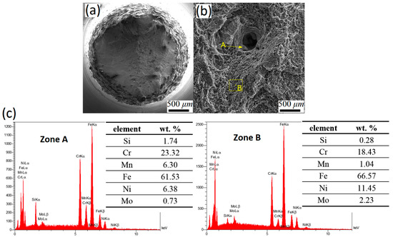 The SEM micrographs of tensile fractured surfaces in conjunction with energy-dispersive X-ray spectroscopy (EDS) analysis are shown in Figure 5 and Figure 6. The fracture surfaces included both the cleavages and dimples as the characteristics of brittle and ductile fracture modes, respectively. However, the ductile mode was the dominant fracture mechanism. In addition, there were some porosities in the fracture surface of the L-PBF samples (white arrow in Figure 5b). Moreover, the EDS analysis of points A and B in Figure 5b showed that in point A, beside the voids, a segregation of alloying elements occurred. There was a similar trend in the case of points A and B in Figure 6 for C-4.8 sample. The segregation of elements in L-PBFed stainless steel 316L has been reported many times [33,34]. A high solidification rate and lack of equal mobility of elements during solidification are the main reasons for obtaining such elemental segregation that may cause the formation of a dislocation wall and can improve the mechanical properties of such steels [33,34].