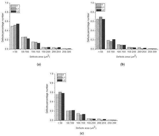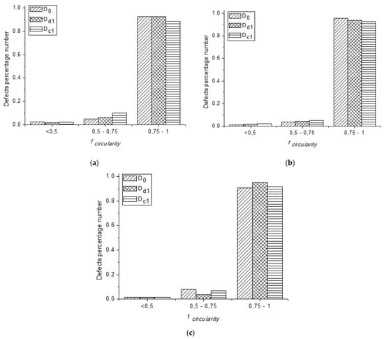 - − The analyzed specimens showed a percentage of defect area less than 0.25% and the defects were mainly circular (more than 80%). The defocus parameter did not affect the number of defects. No significant difference was observed in the defect area fraction for the three specimens. Furthermore, all sections had defects with small area size (lower than 50 µm2).