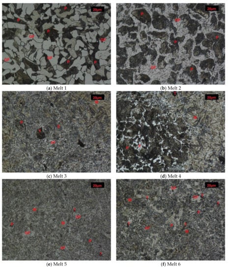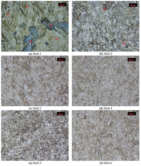 Melts 5 and 6 were also subjected to partial hardening (Figure 1e,f) and their hardness values were similar, equal to 391 and 392 HB (Figure 2). In addition to martensite and hardening troostite, their structures included degenerate pearlite and ferrite showing acicular and granular build.
