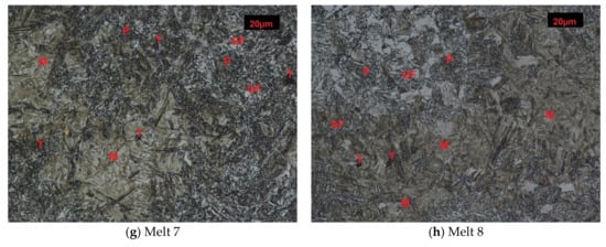 In melt 8, grains were generally fine and more uniform and its structure was similar to that obtained in melt 4, austenitized at a temperature 50 °C lower. No abnormal grains were found (Figure 4h). ASTM grain size GS was 10.38, average grain diameter 8.50 µm, median was close to the average value and minimum and maximum diameters were 1.77 µm and 20.59 µm, respectively (Table 4).