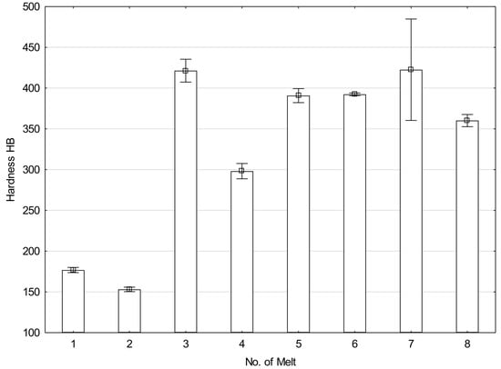 Structures of melts 7 and 8 were not typical for normalization (Figure 1g,h). The structures were composed of martensite and quench troostite, degenerate pearlite and ferrite showing acicular and granular build. Moreover, regular, yellowish precipitates of titanium nitrides were also visible. Hardness of melt 7 equal to 423 HB was similar to that of melt 3 and hardness of melt 8 was 360 HB (Figure 2).