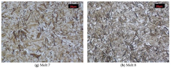 Melt 1 was characterized by large abnormal grains (Figure 3a). After quench-hardening, in their place, a large quantity of residual austenite was visible against a background of acicular martensite. Precipitates of acicular upper bainite could be seen on grain boundaries of former austenite. Martensite in melt 2 was more fine-grained (Figure 3b). Against its background, acicular ferrite were visible. Microstructures of melts 3, 4, 5 and 6 were similar (Figure 3c–f), built of fine-lath quench-hardening martensite. Moreover, regular, yellowish precipitates of titanium nitrides could be seen in melts 3 and 5. The microstructure of melt 7 was composed of medium-lath martensite (Figure 3g). Quench-hardening martensite visible in the microstructure of melt 8 was more fine-grained (Figure 3h) and was similar to martensite in melt 5.