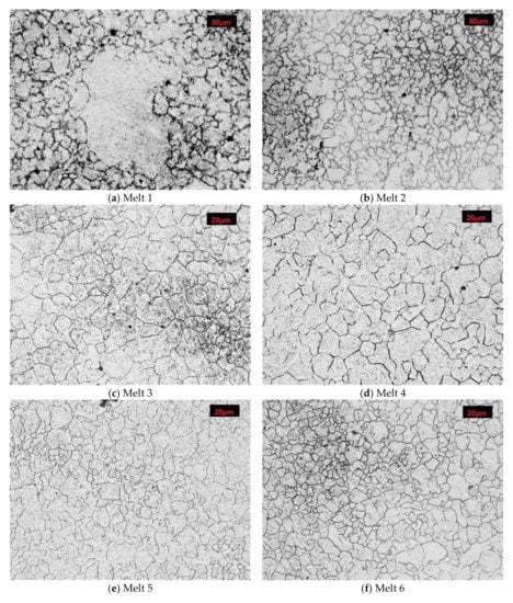 Average grain diameter and the ASTM GS value of melt 6 after austenitizing at 870 °C were 5.89 μm and 11.43, respectively, see Table 4. The grains were fine and uniform (Figure 4f), with the difference between minimum and maximum grain diameters amounted to about 15 µm.