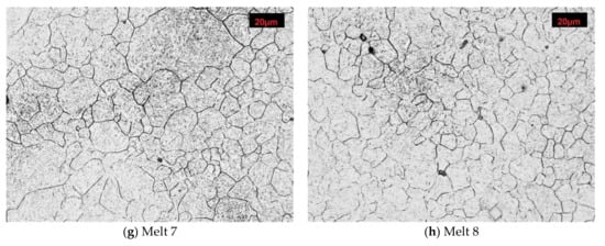 Microstructures of analyzed melts with revealed former austenite grain. Etched, light microscopy. (a) Melt 1, (b) Melt 2, (c) Melt 3, (d) Melt 4, (e) Melt 5, (f) Melt 6, (g) Melt 7, (h) Melt 8.