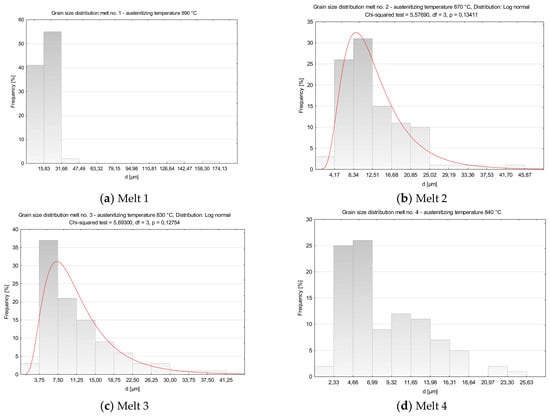 After austenitizing at 890 °C, numerous abnormally large grains surrounded with colonies of fine grains were observed in microstructure of the melt 1 (Figure 4a). Average diameter of former austenite grains was 20.65 µm and minimum and maximum values were 4.15 and 165.34 µm, respectively, see Table 4. Irrespective of the abnormal grains, the smallest grains accounted for ca. 40% of all the grains (Figure 5a). The obtained results could not be approximated by any theoretical distribution.