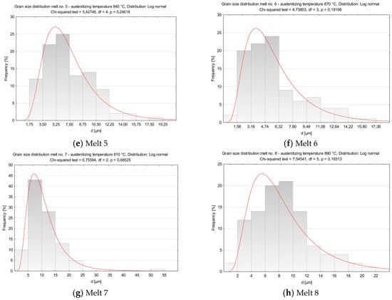 Distributions of austenite grain diameters of the analyzed melts. (a) Melt 1, (b) Melt 2, (c) Melt 3, (d) Melt 4, (e) Melt 5, (f) Melt 6, (g) Melt 7, (h) Melt 8.