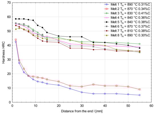 Figure 6 and Figure 7 show hardenability curves of the analyzed melts. In the collective chart (Figure 6), clear differences of hardenability are visible between the melts 1 and 2 and the other melts. The first pair of melts was characterized by low hardenability (Figure 7a) and the measured hardness values dropped very rapidly with the distance from the specimen end face. Basically, there were no differences of hardenability between the melt containing boron and the melt free of boron, and the distances of semi-martensitic zones from the specimen end faces were 1.7 and 2.0 mm, respectively. Additives of chromium in melts 3 and 4 improved their hardenability and their hardenability curves did not show a big drop of hardness measured deeper into the specimens (Figure 7b). Like in the previously analyzed melts, no significant differences of hardenability were noticed between them. The distances of semi-martensitic zones from the specimen end faces were 27.5 and 25.0 mm. Differences in hardenability curves could be seen between melts 5 and 6 only (Figure 7c). The obtained curves could basically be considered parallel, but the curve for melt 6 was shifted towards lower hardness values. The distance of the semi-martensitic zone from the specimen end face was 35.0 mm for melt 5 and 23.5 mm for melt 6. Between the melts 7 and 8, there was the biggest difference in carbon concentration among all the analyzed melts. At the beginning, the hardness values were similar, but started differing significantly at a distance of 10 mm from the specimen end face (Figure 7d) and the curve for the melt 7 was moved towards lower hardness values. The read-out distances of semi-martensitic zones from the specimen face ends for melts 7 and 8 were 20.0 and 45.0 mm, respectively.