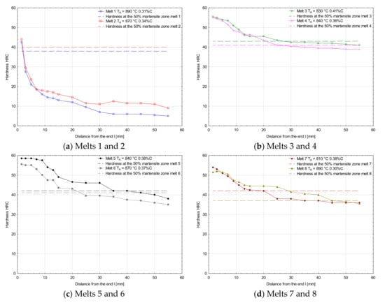 Hardenability curves for the analyzed melts together with hardness values of semi-martensitic zones. (a) Melts 1 and 2, (b) Melts 3 and 4, (c) Melts 5 and 6, (d) Melts 7 and 8.