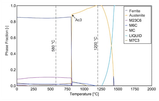 The thermodynamic calculation was carried out by Thermo-Calc software (2020a, Thermo-Calc Software, Solna, Sweden) with the TCFE9 database for the AISI M50 powder composition under a pressure of 1.0 bar. The Ac3 temperature was 818 °C, according to the calculated diagram (Figure 1). The austenitization temperature of conventional heat treatment and HIP temperature was chosen as 1200 °C, where all types of carbides were solved to ensure a complete austenitization. At 580 °C, a large fraction of carbides was visible. These carbides in M50 steel can be used to increase hardness as well as toughness by secondary hardening. Therefore, tempering was performed at 580 °C in this study.
