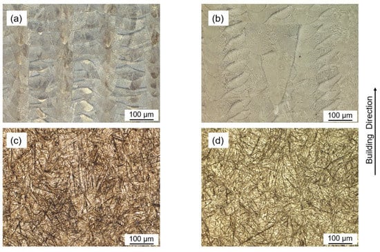 Optical micrographs: (a) as-built with a preheating of 250 °C; (b) as-built with a preheating of 500 °C; (c) conventional heat treatment; (d) HIP integrated with quenching and tempering.