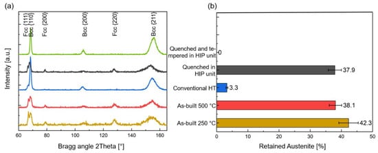 More insights into the phase evolution can be obtained by XRD diffraction patterns, depicted in Figure 9. In as-built condition, both fcc and bcc phases were present. The fcc peaks indicated the presence of retained austenite. Whereas, the bcc peaks represented martensite as well as bainite, since both consisted of a distorted bcc lattice structure. After HIP and quenching, martensite formed from austenite. Retained austenite can also be detected in the sample. During three sessions of tempering, this retained austenite fully transformed into martensite, since no fcc diffraction peak can be detected. The samples conventionally heat treated present a similar diffraction pattern. After hardening and tempering, most of the matrix is martensite with less than 5% retained austenite. Theoretically, the high pressure (150 MPa) in the HIP furnace should decrease the martensite start temperature by around 15 K according to the Clausius–Clapeyron equation [20]. This should result in a higher content of retained austenite. Nonetheless, this slight difference could not be observed from microstructure and XRD pattern since the cooling conditions were different in both furnaces: The cooling rate was higher in the HIP furnace than in the vacuum furnace.