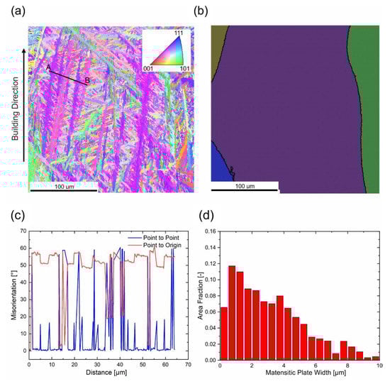 Figure 10a presents the microstructure and grain orientation of the material that was densified and quenched in the HIP furnace by IPF map. Fine martensitic plates formed during the quenching process. The reconstructed parent austenite grains that were based on the K–S orientation relationship by ARPGE software are shown in Figure 10b. These austenite grains were recrystallized during the annealing process from the as-built microstructure. The misorientation distribution profile of martensitic blocks/plates on the AB line in Figure 10a was measured, as shown in Figure 10c, which illustrates the fine martensitic plates in the microstructure. The width distribution of martensitic plates is presented in Figure 10d.