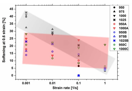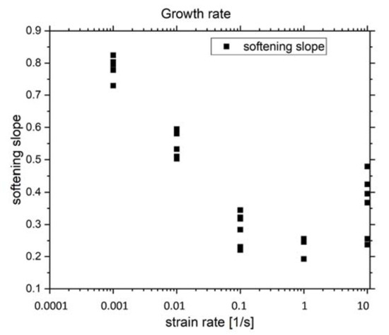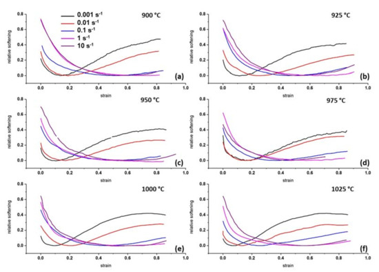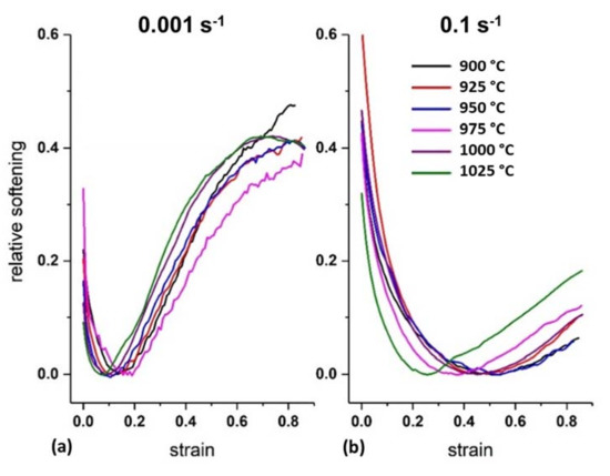 - The relative stress softening is independent of the temperature, meaning that the growth is only dependent on the strain rate. The large stress softening at a low strain rate may be related to two phenomena: the fast recrystallization rate, and the coarsening of pores driven by diffusion;