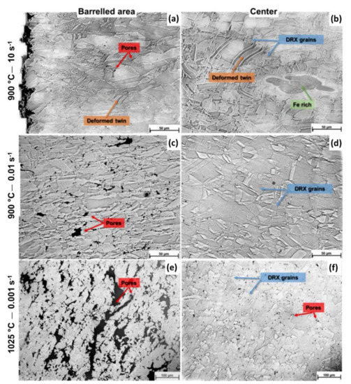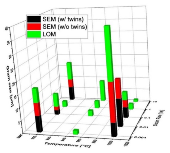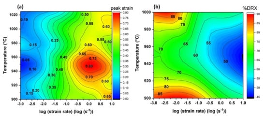 - The recrystallization grade reaches a minimum of 70% at 950 °C due to the competition of dynamic recovery and dynamic recrystallization occurring at low strain rates;