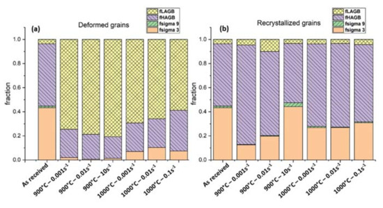 - Deformation takes place by first increasing the amount of low angle grain boundaries, while the Σ3 boundaries become mobile and their fraction decreases with deformation. Recrystallized grains have a large number of Σ3 boundaries, and their fraction increases with increasing strain rate and temperature;