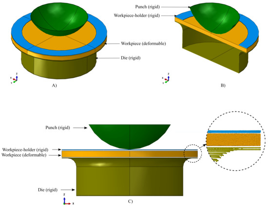 Schematic setup of the all-atom gas detonation forming model. (A) A isometric view, (B) a half sectional isometric view, and (C) 2D front view of the all-atom model. The enlarged view shows gaps between die, workpiece, and workpiece-holder.
