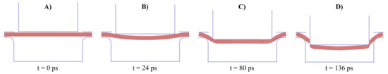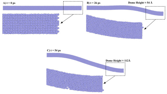 Figure 4 shows the snapshots of the workpiece (with no voids) deformation before the complete failure at different loading speeds. For the low loading speed simulations (0.1 Å/ps), the required simulation time to get maximum dome-height without failure was 1.18 ns (see Figure 4A). For medium (0.8 Å/ps) and high-speed (6 Å/ps) simulations, the required simulation times were 0.12 ns and 0.01 ns, respectively. Moreover, the formability of the aluminum workpiece was lower for higher speeds.