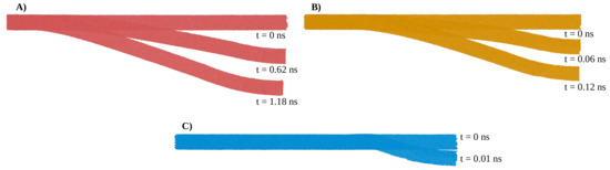 In this study, it is assumed that failure occurs when the applied load crosses the potential barrier, and the atoms start to separate from each other; which can be seen effectively in the force versus simulation time diagram (refer to Figure 9A)), where the force is derived from the negative gradient of the potential energy. Therefore, once the force reaches a peak value, a failure starts, and a significant decrease is observed in forces after the peak.