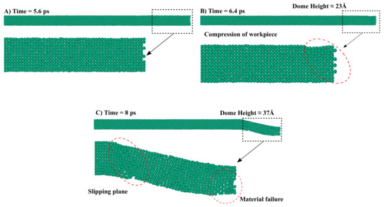 Different stages of loading at 8 Å/ps. (A) shows the initial condition with detailed view, i.e., at Time = 5.6 ps. (B) shows the intermediate position of the workpiece with detailed view at Time = 6.4 ps, where the dome-height at this time is approximately 23 Å. (C) shows the position of workpiece just at the failure with detailed view, i.e., where the dome-height is approximately 37 Å.