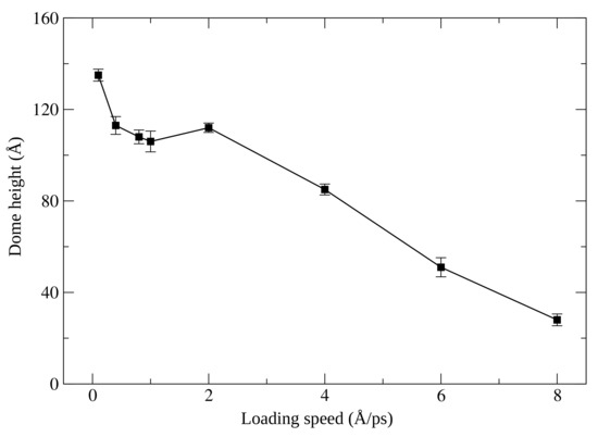 Figure 7 depicts the variation of dome-height with respect to loading speed. The highest dome-height of approximately 133 Å was observed at the lowest speed of 0.1 Å/ps, and the lowest dome-height of approximately 29 Å at the highest loading speed of 8 Å/ps. Therefore, we found the inverse relationship between the loading speed and dome-height.