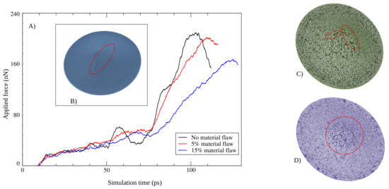 In addition to the cases of different constant loading speeds, we investigated different workpiece models with varying degrees of the material flaw where internal voids ranging from 5 to 20% were considered. In this investigation, one constant speed of 0.1 Å/ps was considered. The punch moves downwards towards the workpiece at a constant speed of 0.1 Å/ps, which is converted to the applied force (expressed in nN) in Figure 9A. The red-colored elliptical markings in Figure 9 B, Figure 9 C indicate the locations of failure or fracture of the models with no material flaw in Figure 9B and 5% voids in Figure 9C, and 15% voids in Figure 9D respectively.