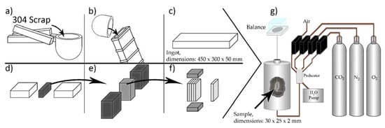 Sample preparation and test setup: (a) scrap pieces of AISI 304 slabs are melted in a vacuum induction furnace, (b) pouring the molten metal to a casting mould, (c) solidified laboratory slab, (d) cross sectioning of the slab, (e) further cross-sectioning from the middle of the slab, (f) slicing of the middle piece into test samples, (g) TG furnace setup with associated major components with an arrow pointing to the sample location in the furnace. Other major parts of the system are named, and the ingot and sample size are shown. Not to scale.