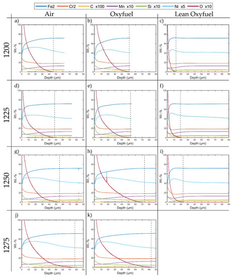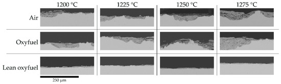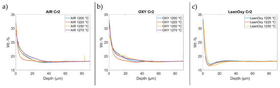The individual Cr GDOES depth profiles for (a) air, (b) oxyfuel and (c) lean oxyfuel atmospheres can be seen in Figure 10. The overall shape of the GDOES depth profile curves in each temperature were similar between the atmospheres; that is, both 1225 °C temperature Cr depth curves show a similar sharp drop from around 33 wt. % to 19 wt. % between the first 10 µm in both atmospheres. While the wt. % curves for other temperatures between the atmospheres do not exhibit the same numbers, the shape remains similar. For the air atmosphere, the Cr depth curves of 1200 °C and 1250 °C followed each other very closely. For oxyfuel atmosphere, the 1250 °C and 1275 °C Cr depth curves followed each other closely.
