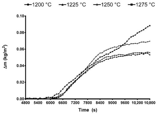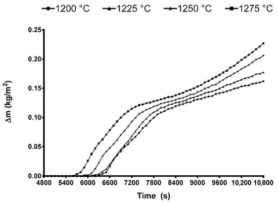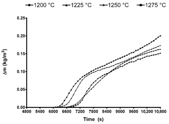 The TG results for mass change as a function of time for air atmosphere can be found in Figure 4. It can be observed that the overall oxide scale formation rate is similar between all the other temperatures with the exception of 1225 °C. For a period between 7100 and 8400 s in the test, it can be seen that the 1225 °C sample has a more linear oxidation behaviour when compared to the other samples in this atmosphere. While the oxidation rate for the 1200 °C sample between the same period is higher than the one at 1225 °C, the end scaling amount order increases with temperature. The point at which oxidation accelerated correlates well with the temperature, with the onset of the higher oxidation rate for 1200 °C happening at 6700 s, for 1225 °C at 6600 s, for 1250 °C at 6200 s and for 1275 °C at 6050 s.